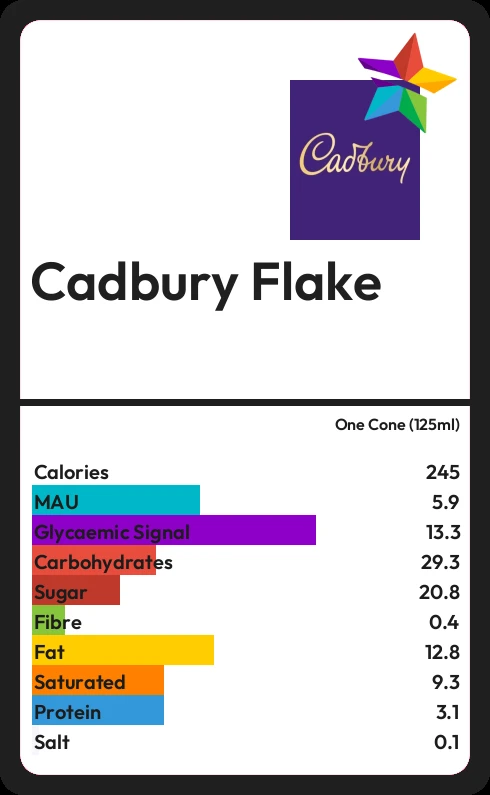 Cadbury Flake contains 20.8g sugar in one Cone (125ml) - that is around 5 cubes of sugar.