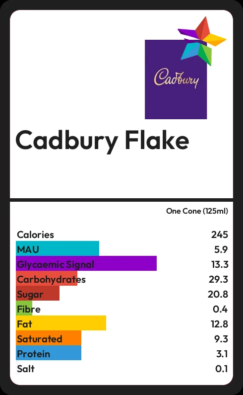 Cadbury Flake contains 20.8g sugar in one Cone (125ml) - that is around 5 cubes of sugar.