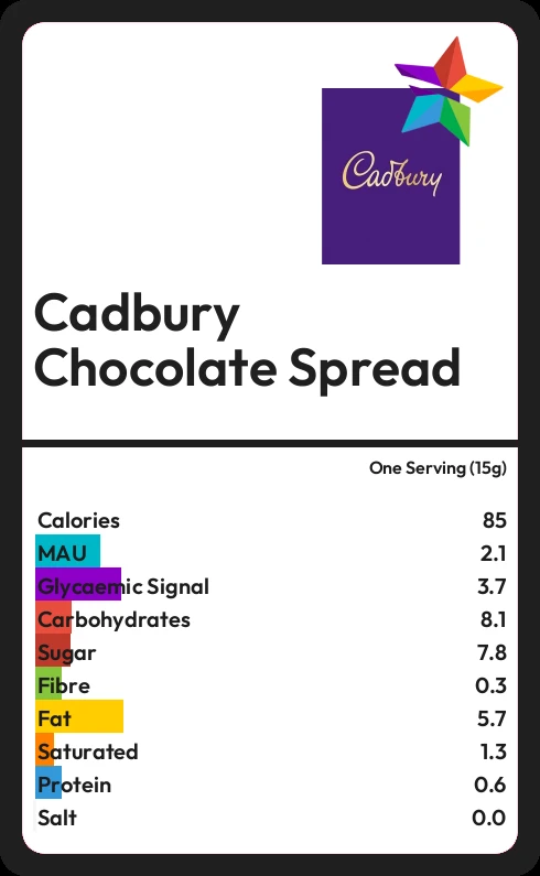 Cadbury Chocolate Spread contains 7.8g sugar in one Serving (15g) - that is around 2 cubes of sugar.