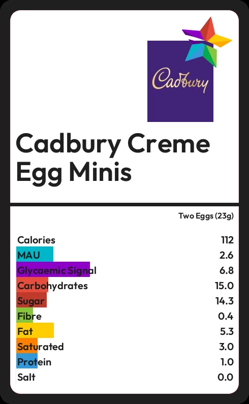Cadbury Creme Egg Minis contains 14.3g sugar in two Eggs (23g) - that is around 4 cubes of sugar.