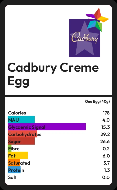 Cadbury Creme Egg contains 26.6g sugar in one Egg (40g) - that is around 7 cubes of sugar.
