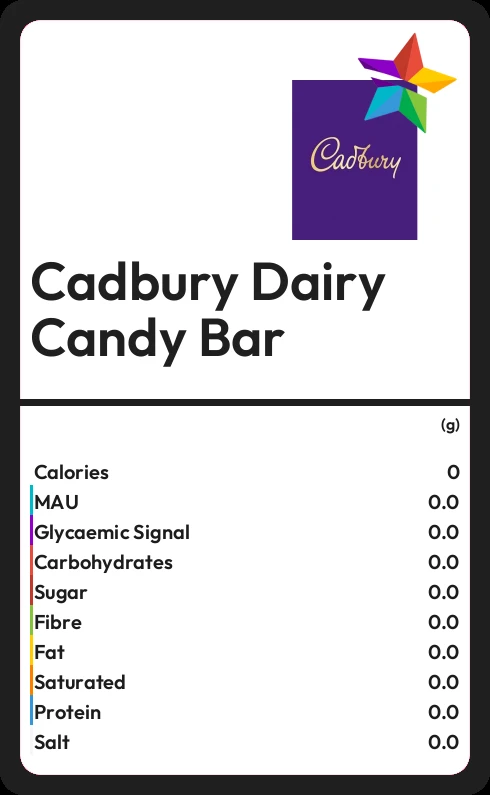 In 100g of Cadbury Dairy Candy Bar there are 26.5g of fat of which 16.0g are saturated.