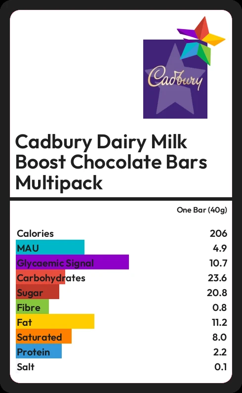 Cadbury Dairy Milk Boost Chocolate Bars Multipack contains 20.8g sugar in one Bar (40g) - that is around 5 cubes of sugar.