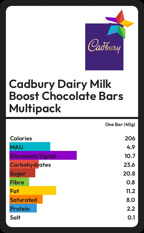 Cadbury Dairy Milk Boost Chocolate Bars Multipack contains 20.8g sugar in one Bar (40g) - that is around 5 cubes of sugar.