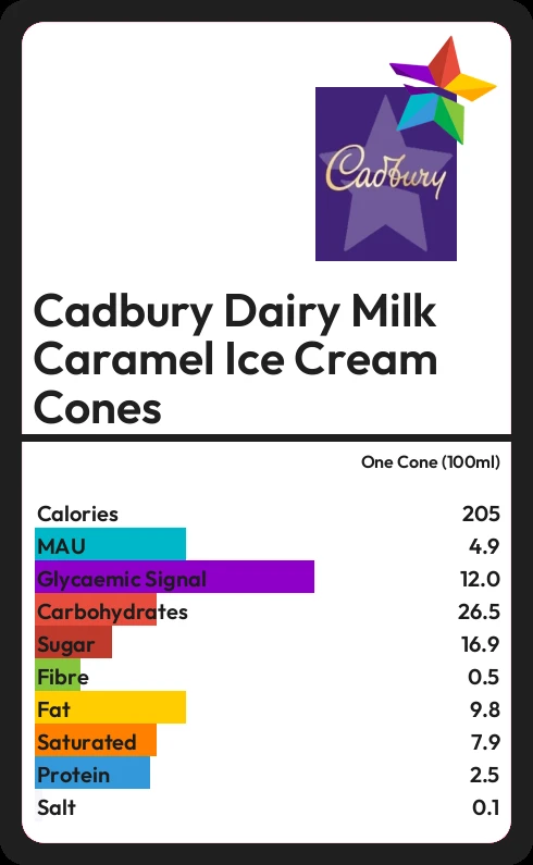 Cadbury Dairy Milk Caramel Ice Cream Cones contains 16.9g sugar in one Cone (100ml) - that is around 4 cubes of sugar.