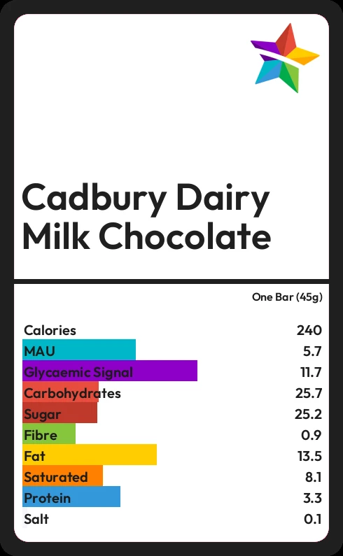Cadbury Dairy Milk Chocolate contains 25.2g sugar in one Bar (45g) - that is around 6 cubes of sugar.