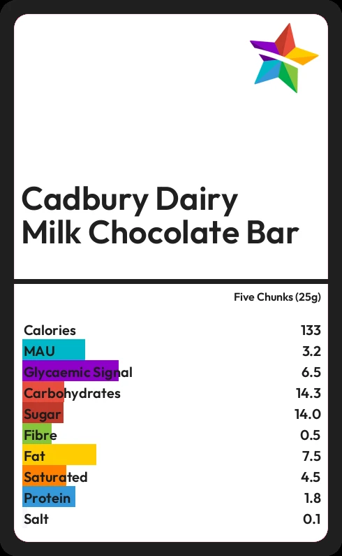 Cadbury Dairy Milk Chocolate Bar contains 14.0g sugar in five Chunks (25g) - that is around 4 cubes of sugar.