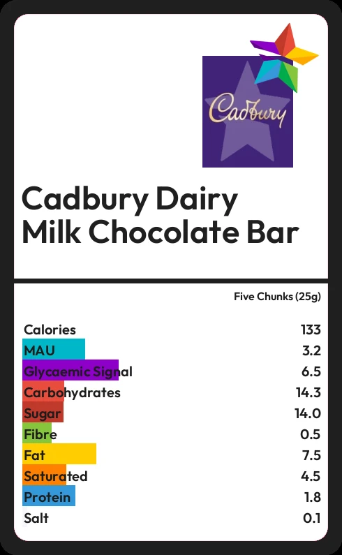 Cadbury Dairy Milk Chocolate Bar contains 14.0g sugar in five Chunks (25g) - that is around 4 cubes of sugar.