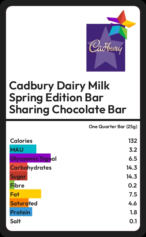 Cadbury Dairy Milk Spring Edition Bar Sharing Chocolate Bar contains 14.3g sugar in one Quarter Bar (25g) - that is around 4 cubes of sugar.