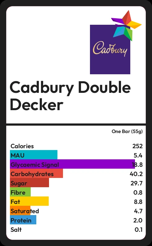Cadbury Double Decker contains 29.7g sugar in one Bar (55g) - that is around 7 cubes of sugar.