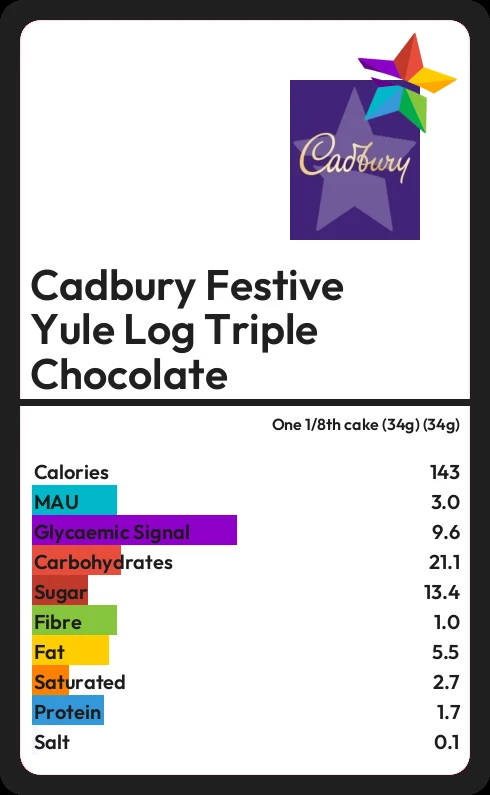 Cadbury Festive Yule Log Triple Chocolate contains 13.4g sugar in one 1/8th cake (34g) (34g) - that is around 3 cubes of sugar.