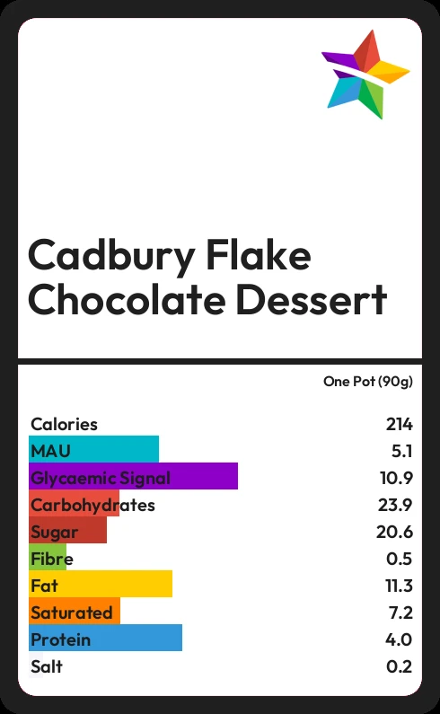 Cadbury Flake Chocolate Dessert contains 20.6g sugar in one Pot (90g) - that is around 5 cubes of sugar.