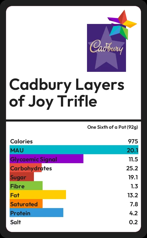 Cadbury Layers of Joy Trifle contains 19.1g sugar in one Sixth of a Pot (92g) - that is around 5 cubes of sugar.