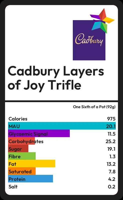 Cadbury Layers of Joy Trifle contains 19.1g sugar in one Sixth of a Pot (92g) - that is around 5 cubes of sugar.