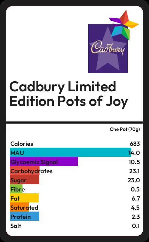 Cadbury Limited Edition Pots of Joy contains 682.5 calories in one Pot (70g).