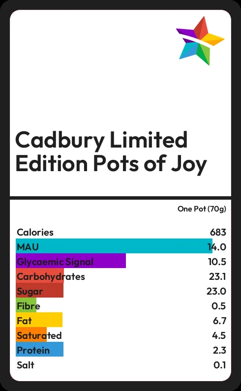 Cadbury Limited Edition Pots of Joy contains 682.5 calories in one Pot (70g).