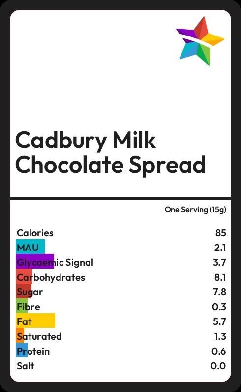 Cadbury Milk Chocolate Spread contains 7.8g sugar in one Serving (15g) - that is around 2 cubes of sugar.