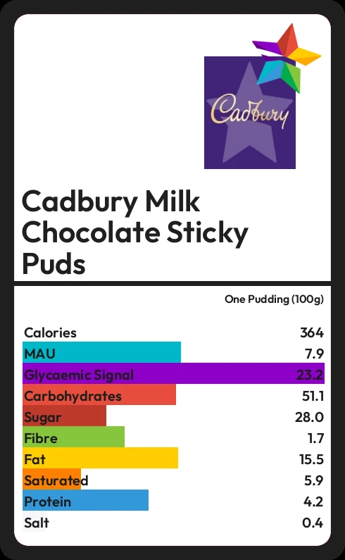 Cadbury Milk Chocolate Sticky Puds contains 28.0g sugar in one Pudding (100g) - that is around 7 cubes of sugar.