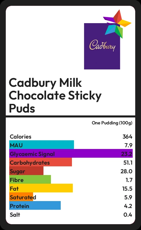 Cadbury Milk Chocolate Sticky Puds contains 28.0g sugar in one Pudding (100g) - that is around 7 cubes of sugar.