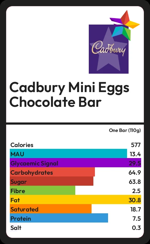 Cadbury Mini Eggs Chocolate Bar contains 63.8g sugar in one Bar (110g) - that is around 16 cubes of sugar.