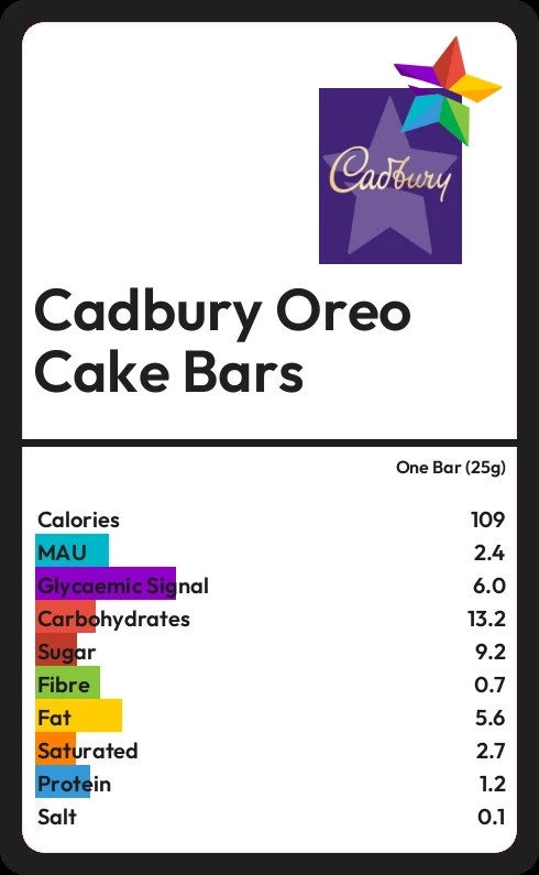 Cadbury Oreo Cake Bars contains 9.2g sugar in one Bar (25g) - that is around 2 cubes of sugar.