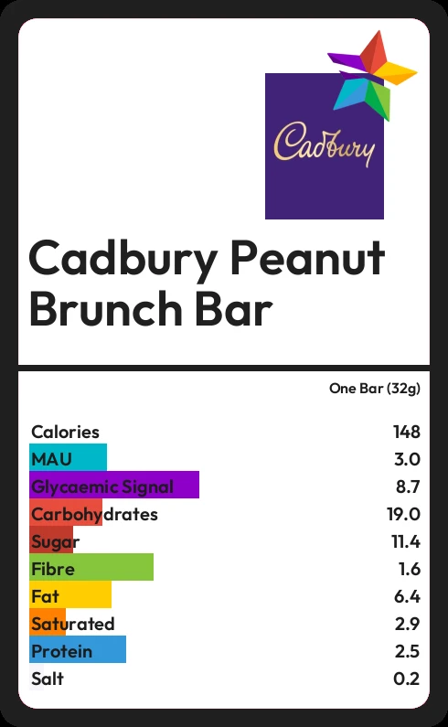 Cadbury Peanut Brunch Bar contains 147.5 calories in one Bar (32g).