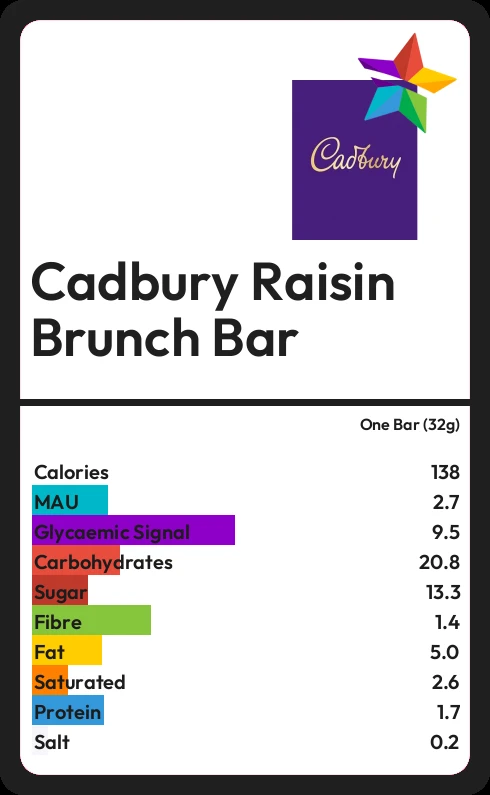 Cadbury Raisin Brunch Bar contains 13.3g sugar in one Bar (32g) - that is around 3 cubes of sugar.