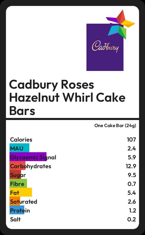 Cadbury Roses Hazelnut Whirl Cake Bars contains 9.5g sugar in one Cake Bar (24g) - that is around 2 cubes of sugar.