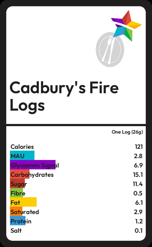 Cadbury's Fire Logs contains 11.4g sugar in one Log (26g) - that is around 3 cubes of sugar.