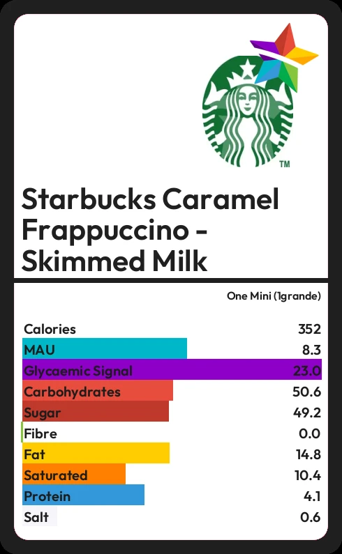 Starbucks Caramel Frappuccino - Skimmed Milk contains 352 calories in one Mini (1grande).