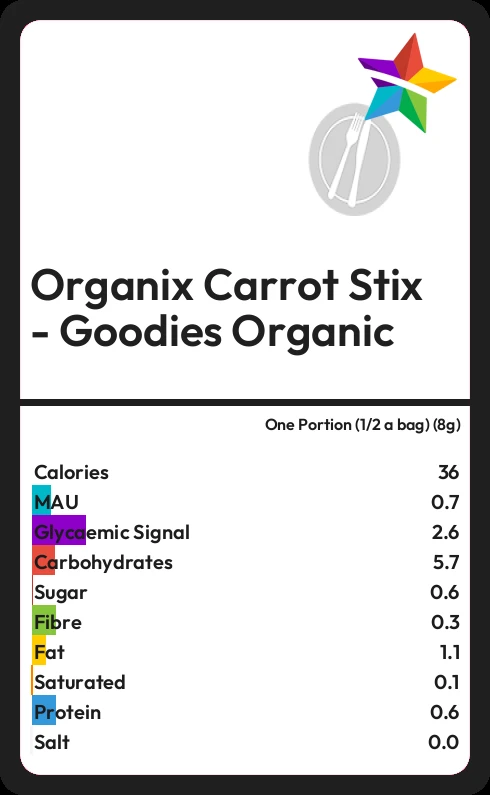 Organix Carrot Stix - Goodies Organic contains 35.8 calories in one Portion (1/2 a bag) (8g).