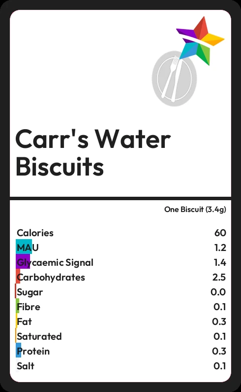 Carr's Water Biscuits contains 59.8 calories in one Biscuit (3.4g).