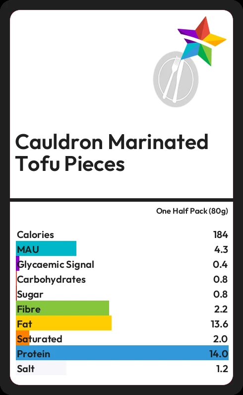 Cauldron Marinated Tofu Pieces contains 184.8 calories in one Half Pack (80g).