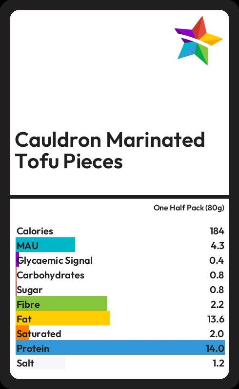 Cauldron Marinated Tofu Pieces contains 184.8 calories in one Half Pack (80g).