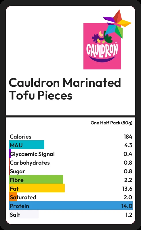 Cauldron Marinated Tofu Pieces contains 184.8 calories in one Half Pack (80g).