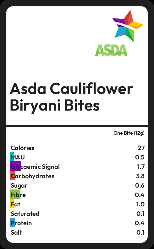 Asda Cauliflower Biryani Bites contains 0.6g sugar in one Bite (12g)