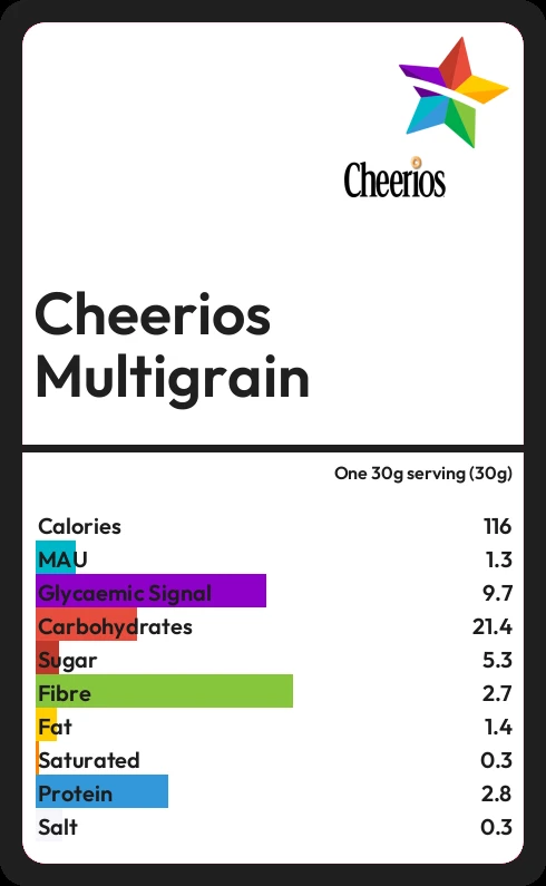 Cheerios Multigrain contains 5.3g sugar in one 30g serving (30g) - that is around 1 cube of sugar.