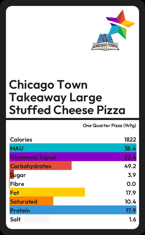 Chicago Town Takeaway Large Stuffed Cheese Pizza contains 3.9g sugar in one Quarter Pizza (149g) - that is around 1 cube of sugar.