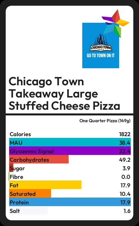 Chicago Town Takeaway Large Stuffed Cheese Pizza contains 3.9g sugar in one Quarter Pizza (149g) - that is around 1 cube of sugar.