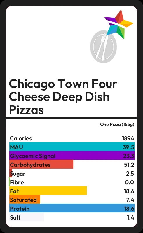 Chicago Town Four Cheese Deep Dish Pizzas contains 2.5g sugar in one Pizza (155g) - that is around 1 cube of sugar.