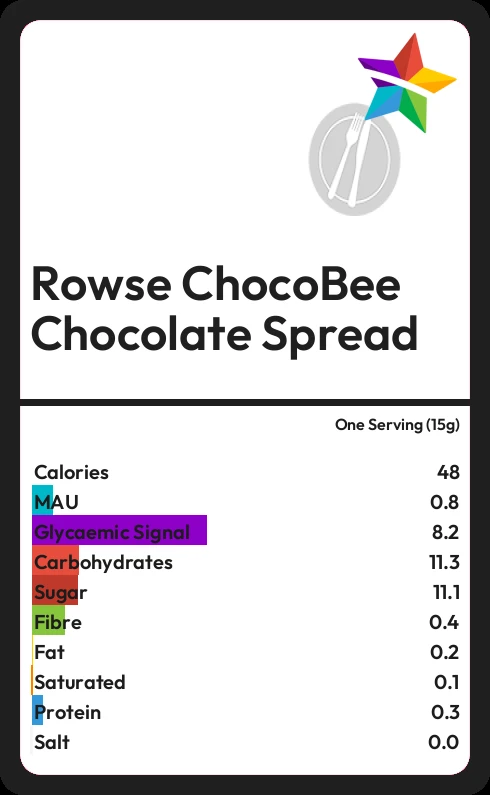 Rowse ChocoBee Chocolate Spread contains 11.1g sugar in one Serving (15g) - that is around 3 cubes of sugar.