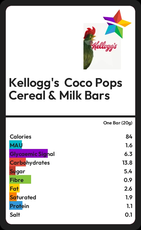 Kellogg's Coco Pops Cereal & Milk Bars contains 5.4g sugar in one Bar (20g) - that is around 1 cube of sugar.