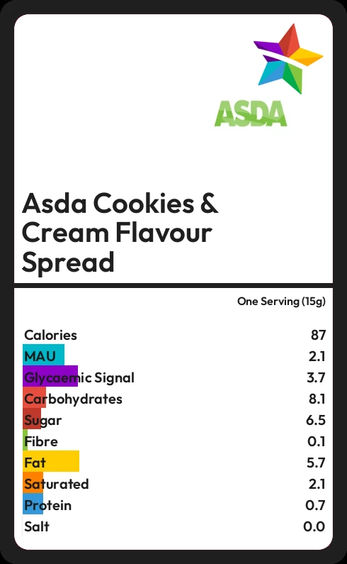 Asda Cookies & Cream Flavour Spread contains 86.7 calories in one Serving (15g).