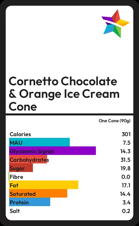 Cornetto Chocolate & Orange Ice Cream Cone contains 19.8g sugar in one Cone (90g) - that is around 5 cubes of sugar.
