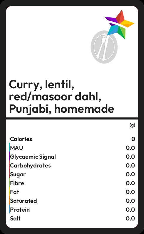 Curry, lentil, red/masoor dahl, Punjabi, homemade contains 3.9g sugar in 100g - that is around 1 cube of sugar.