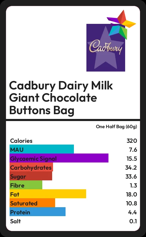 Cadbury Dairy Milk Giant Chocolate Buttons Bag contains 33.6g sugar in one Half Bag (60g) - that is around 8 cubes of sugar.