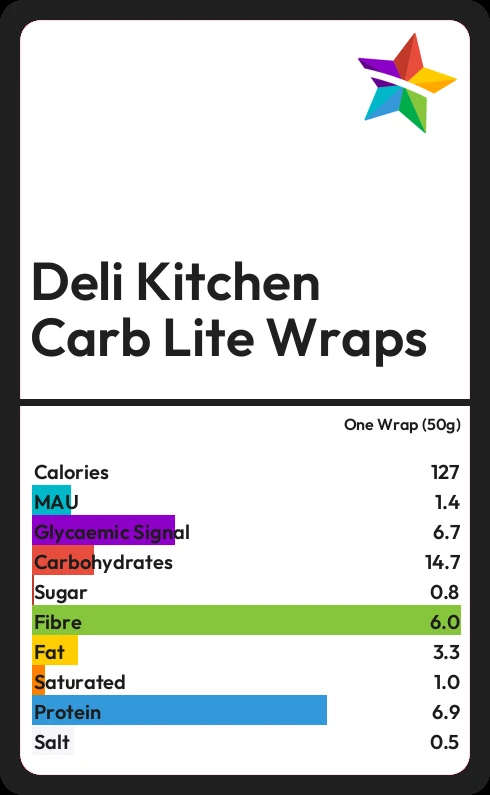 Deli Kitchen Carb Lite Wraps contains 127 calories in one Wrap (50g).
