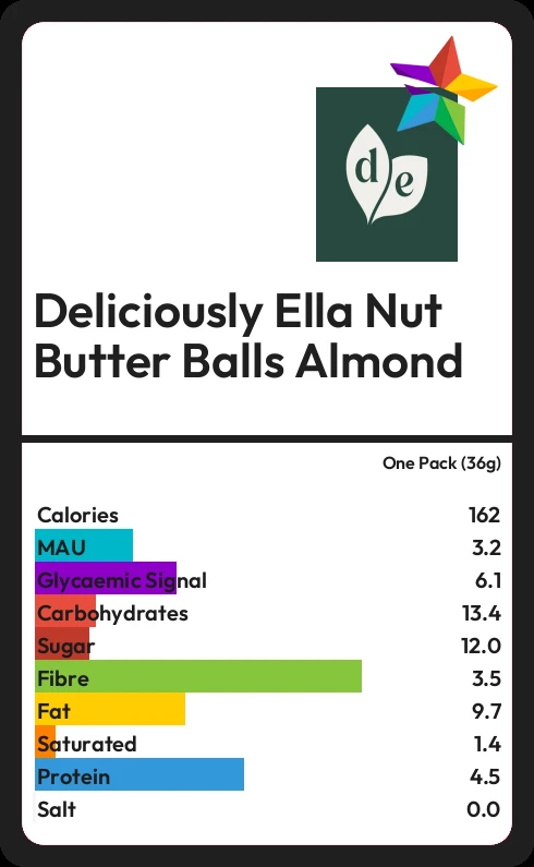 Deliciously Ella Nut Butter Balls Almond contains 12.0g sugar in one Pack (36g) - that is around 3 cubes of sugar.