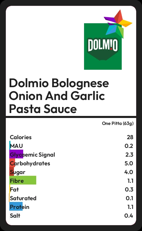 Dolmio Bolognese Onion And Garlic Pasta Sauce contains 27.7 calories in one Pitta (63g).