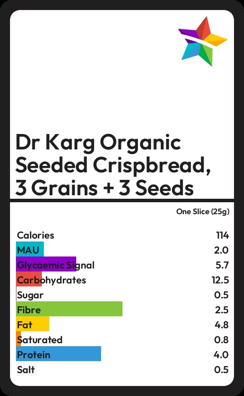 Dr Karg Organic Seeded Crispbread, 3 Grains + 3 Seeds contains 0.5g sugar in one Slice (25g)